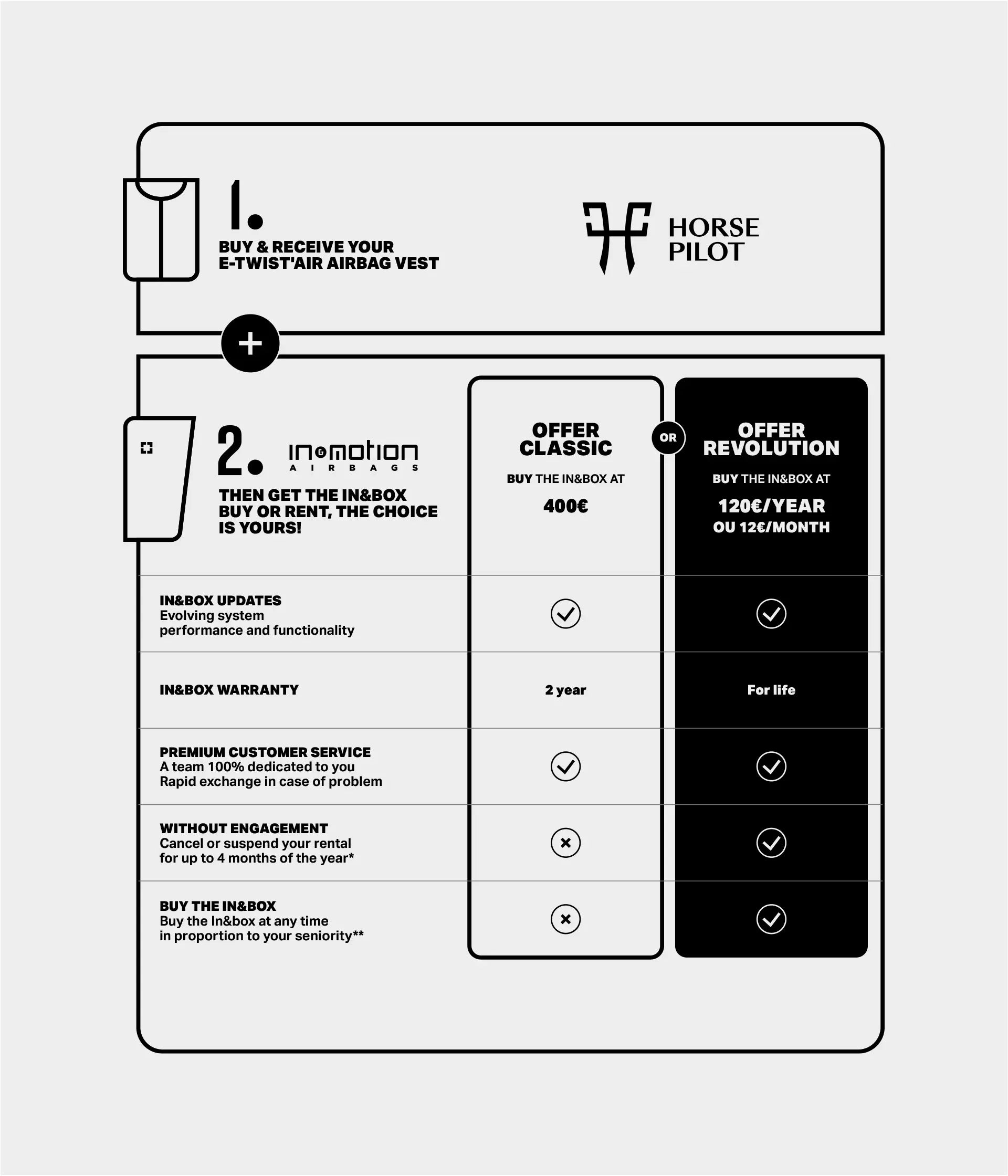 The E-Twist'Air Airbag is the first electronic airbag in the equestrian world. Its ultra-fast on-board my In&box technology (visit shop.inemotion.com for activation), triggers automatically in the event of a fall, providing uncompromising safety and comfort. The airbag is sold with a cartridge. In&Box subscription can be purchased on the In&Motion website.
